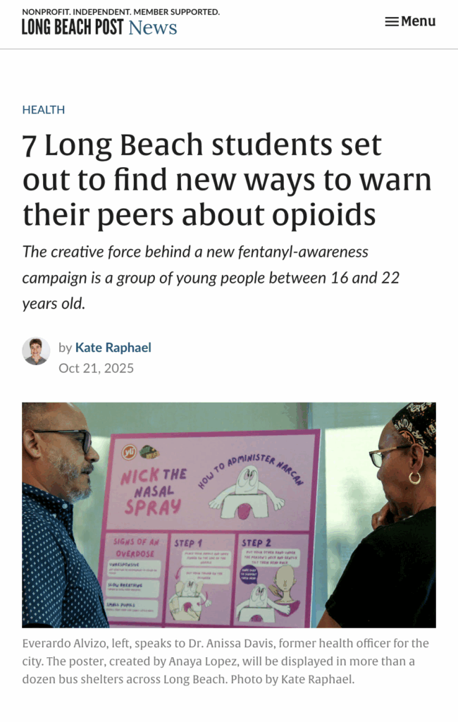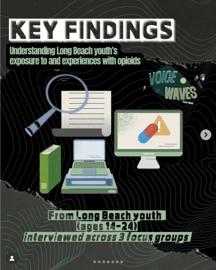 En colaboración con la Programa de reducción de daños del Departamento de Salud y Servicios Humanos de la ciudad de Long BeachSiete jóvenes líderes de VoiceWaves completaron con éxito la primera campaña de concientización sobre opioides financiada por la ciudad y dirigida por jóvenes en Long Beach. Durante el año que duró el proyecto, realizaron grupos de discusión entre pares, lanzaron una campaña en redes sociales, produjeron más de 250 fanzines sobre reducción de daños y organizaron una presentación pública que reunió a funcionarios municipales, miembros de la comunidad y estudiantes para aprender técnicas de administración de Narcan y de detección de fentanilo, que pueden salvar vidas.